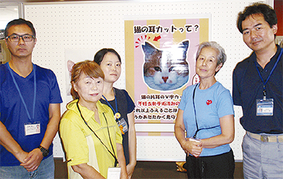 区役所で行われた展示では、制度PRのほか、手術済みであることを示すために猫の片耳をV字にカットすることや、猫を捕獲し手術するまでの活動を写真付きで紹介した。