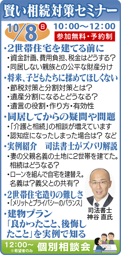 講師は相続が専門の司法書士・神谷氏。実際に受けた多くの相談事例をもとに対策や解決方法を紹介。お金や介護、遺言、相続など様々な問題を分かりやすく解説する。また同社の1級建築士で多くの2世帯住宅造りをしてきた河合氏が、メリットとプライバシーのバランス、介護や防犯・相続税のメリット、建物プランの実例などを紹介。ぜひ参加を。