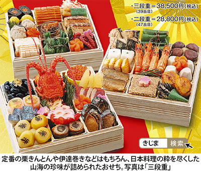 戸塚の日本料理の名店「おもてなし館きじま本陣」の数量限定「おせち」が発売開始から10周年を迎えた。伊勢海老黄金焼きなど39品から成る伝統を踏まえた「三段重」と、華やかな47品の多種多品目から成る「二段重」を用意。どちらも総料理長指揮の下、本陣の特長を生かした海鮮を数多く盛り込んだ手作りおせちに仕上がっている。