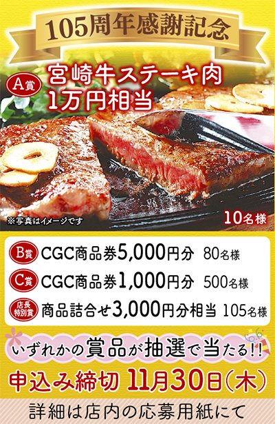 「スーパーたまや」を運営する株式会社たまや(本社茅ヶ崎市浜竹)は創業105周年。記念感謝イベントとして週替わりセールに加え約700人に当たるキャンペーンを実施する。