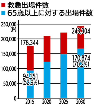 予測には消防局が持つ、15年間分約250万人の救急搬送記録を使用。さらに人口や外国人宿泊者数の増減などを加味し、データが揃う2030年までの予測をした。この結果、30年には年間24万件超にのぼると算出された。それによると、交通事故による救急出場が減る一方、急病と一般負傷は増加。特に65歳以上に対する出場件数は、全体の約70%に及ぶ(15年は約53%)ことがわかった。
