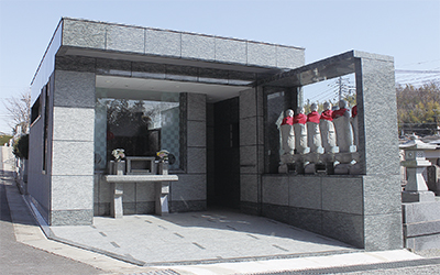 洗練された方形の外観や、市松模様の描かれたガラス窓、フラットなアプローチなど、モダンなデザインが特徴。一方で目立ちすぎることもなく、周りにある旧来の墓石と調和がとれているのも印象深い。