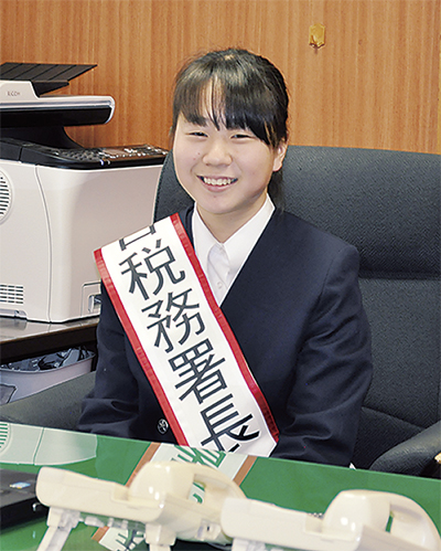 豊田中3年の鈴木玲菜さんが3月23日、戸塚税務署初の取り組みである「一日税務署長イベント」で初代一日署長に就任し、業務で活躍した。