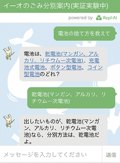 利用者が質問を入力すると同局のイメージキャラクター「イーオ」が会話調で回答。例えば「電池の捨て方を教えて」と質問を入力すると「電池は乾電池、充電式電池、ボタン型電池、コイン型電池のどれ?」と返事が来る。自分が捨てたい電池の種類を選択すると捨て方を知ることができる。