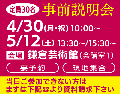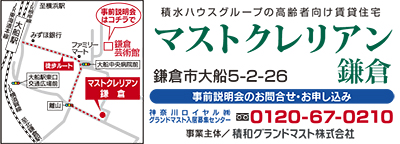 同所の事前説明会が4月30日(月・祝)と5月12日(土)に開催される。場所は、大船駅徒歩10分の鎌倉芸術館。完全予約制、各時間30名定員。「良いお部屋は先に埋まってしまいます。ぜひ説明会にご参加下さい」