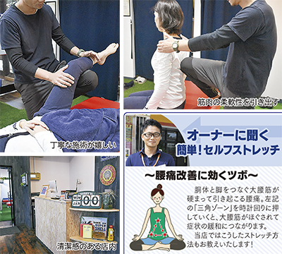 同店を“駆け込み寺”とするのは、腰や膝の痛みに悩む人々。その原因のほとんどが「筋肉の委縮や硬化」だという。そこで同店では、筋膜(筋肉を包む膜)をほぐして柔軟性を引き出し、痛みの周辺箇所にもアプローチ。「こうして痛みの根本を突き詰め、慢性化を防ぐ」とポイントを話す。