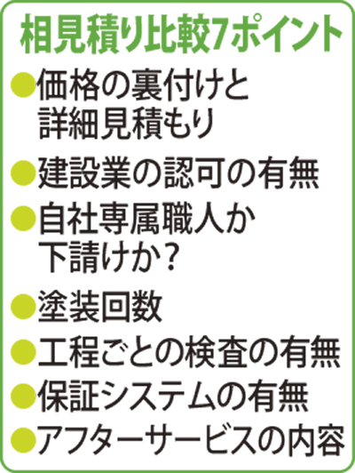 外壁の塗替えを検討する際、意外と実践する人が少ない「相見積り」について「最低でも3社以上から取り寄せるのが鉄則ですよ!」と推奨する同社が教える「比較7ポイント」(表)などが記載されたこの一冊。