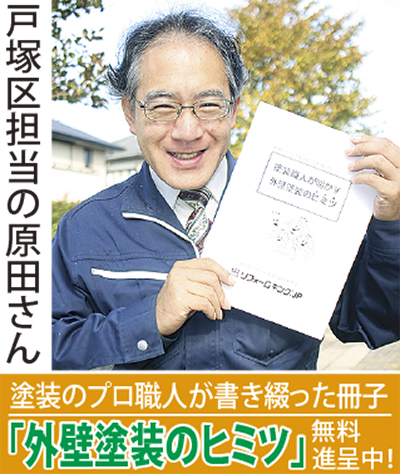 「自社専属職人による施工」や「安心の価格」「最長20年の保証」といった利用者本位の営業方針と、戸塚区担当スタッフ・原田さん=写真=の親身な対応が好評を博している「リフォームキング」は見積り希望の人に小冊子「外壁塗装のヒミツ」を無料で進呈。