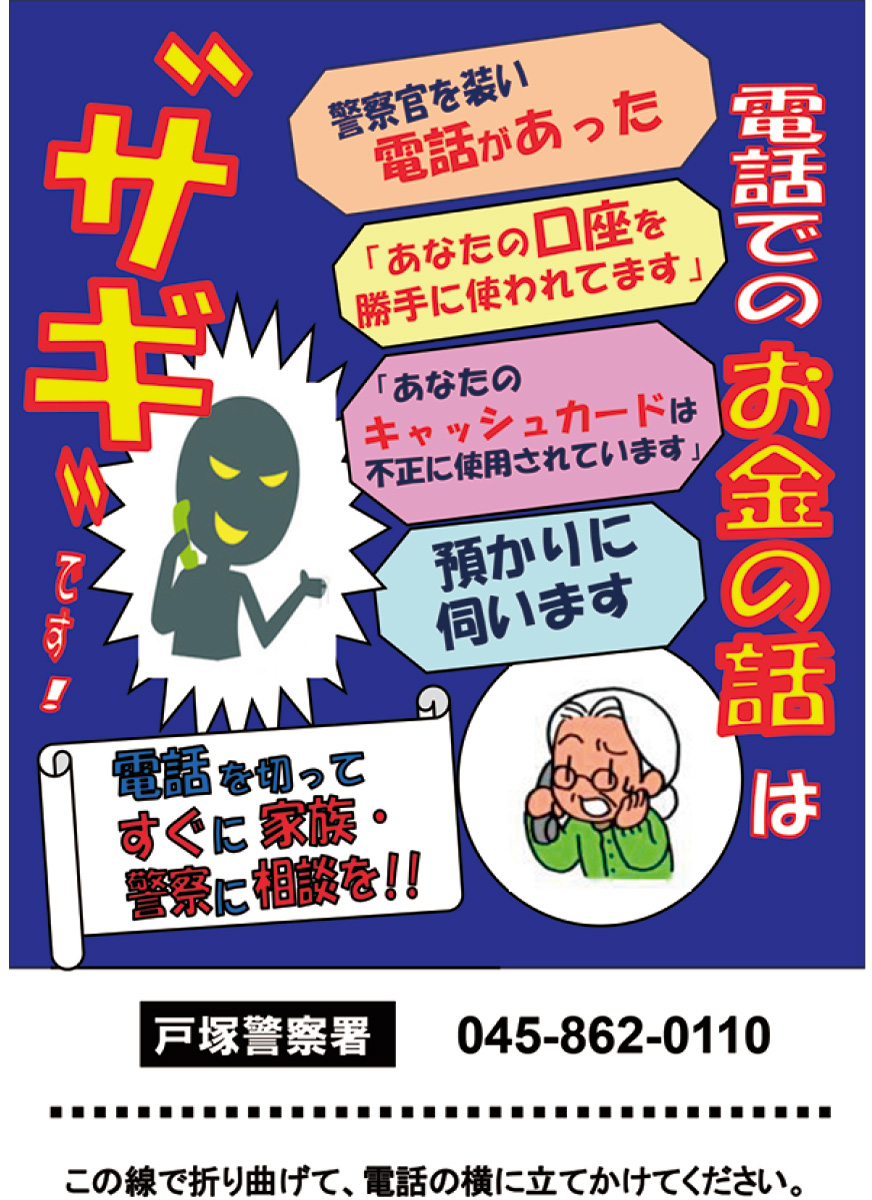 戸塚警察署は「金融機関職員などがカード類を取りに行くことは絶対にない。迷惑電話防止付き機器の購入、留守番電話の設定をお願いしたい」と呼びかけている。