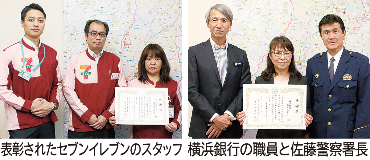 振り込め詐欺を未然防止したとして、セブンイレブン横浜深谷町店(西浜忍店長)と横浜銀行新戸塚支店(渡辺晋作支店長)に対し、戸塚警察署から感謝状が手渡された。