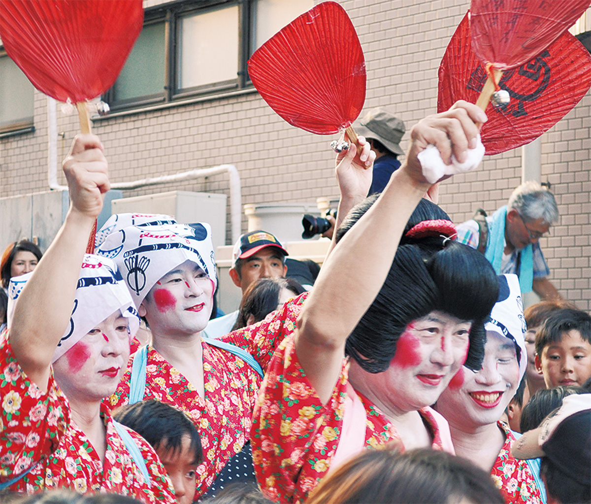 恒例行事の「お札まき」では、女性の着物をまとい白塗りの化粧を施した約10人ほどの男性たちが、五穀豊穣や無病息災の祈願を込めた歌を歌いながら踊りを披露。その後、一行は町内を巡回し、ご利益があるといわれる札をまいた。参加者はこぞって取りに行き、大いに盛り上がりを見せた。