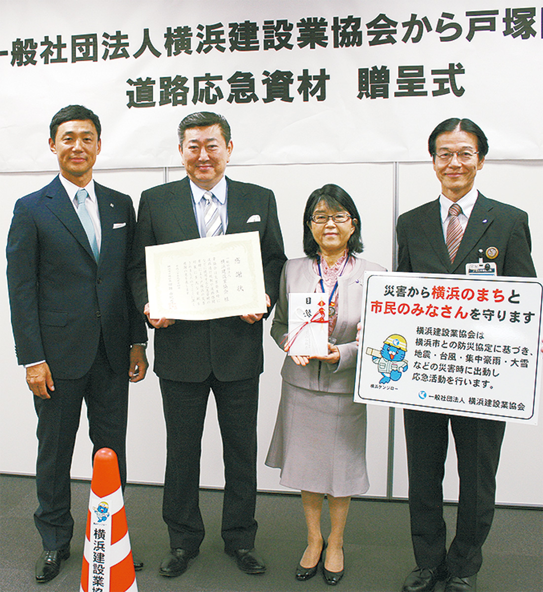 (一社)横浜建設業協会が9月14日、戸塚区に災害時の道路応急資材としてカラーコーン200本、コーンバー200本、通行止め看板などを寄贈した。これらは国道1号線など緊急輸送路の資材置場に配備される。