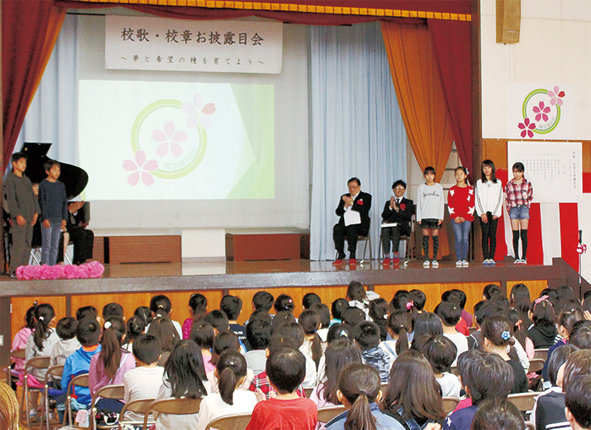 「お披露目式」には児童のほか、地域の関係者や保護者が来場。校章が披露されたほか、全校児童による校歌の発表が、校歌を作曲した富澤裕さんの指揮のもと行われた。