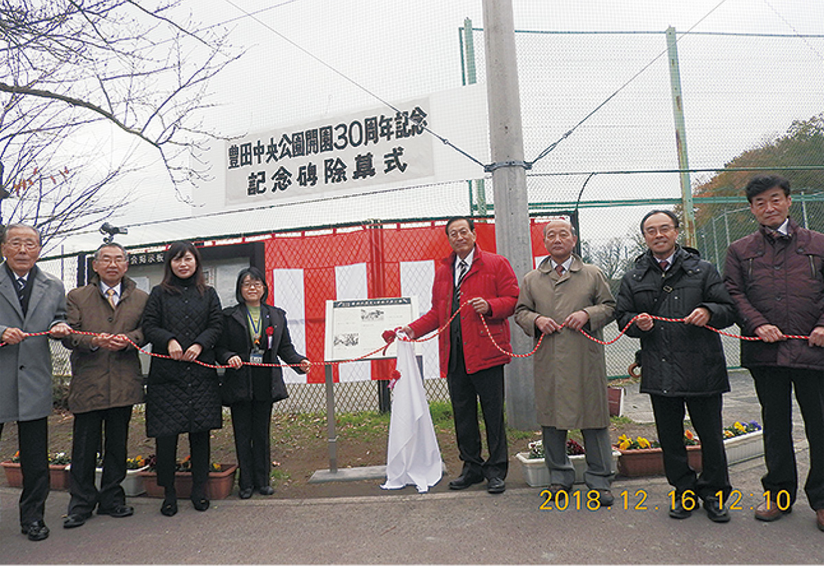 下倉田町の豊田中央公園が開園30周年を迎え、記念式典が昨年の12月半ばに開催された。当日は周辺地域の関係者らが集い、公園に建てられた「記念碑」が披露された。