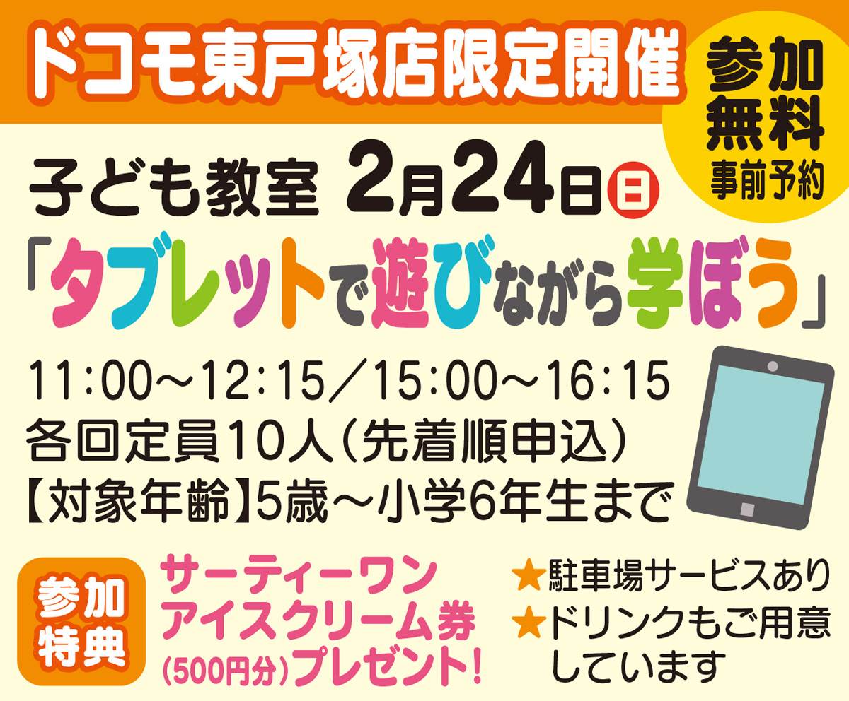 ドコモショップ東戸塚店では、ドコモオリジナルの学習コンテンツを使って遊びながら勉強できる「こども教室」を2月24日(日)に開催。1人1台タブレットを使い、ゲームやキャラクターなどと一緒に楽しく学べる。