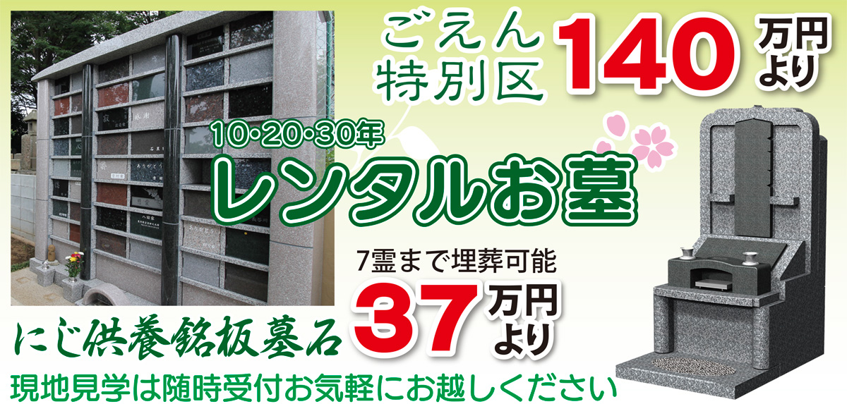 使用者だけの墓石を設置できる「にじ」、個別納骨棺に遺骨を納める「ごえん」、一区画まるごと使用者専用となる「ごえん特別区」など予算や理想に合わせた様々なかたちを用意している。