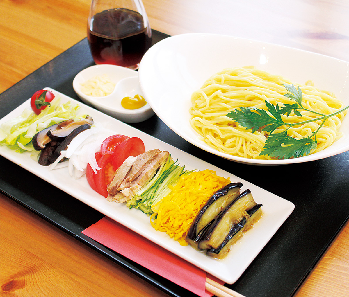 レストランではこれからの時季にぴったりな冷やし中華を始めた。新鮮な野菜の味と、香り高くのど越しの良い麺がマッチし、すでに人気を集めている。商品名は「たのしんで」。斬新な盛り付けと色彩を、季節の味とともに楽しめる一品となっている。
