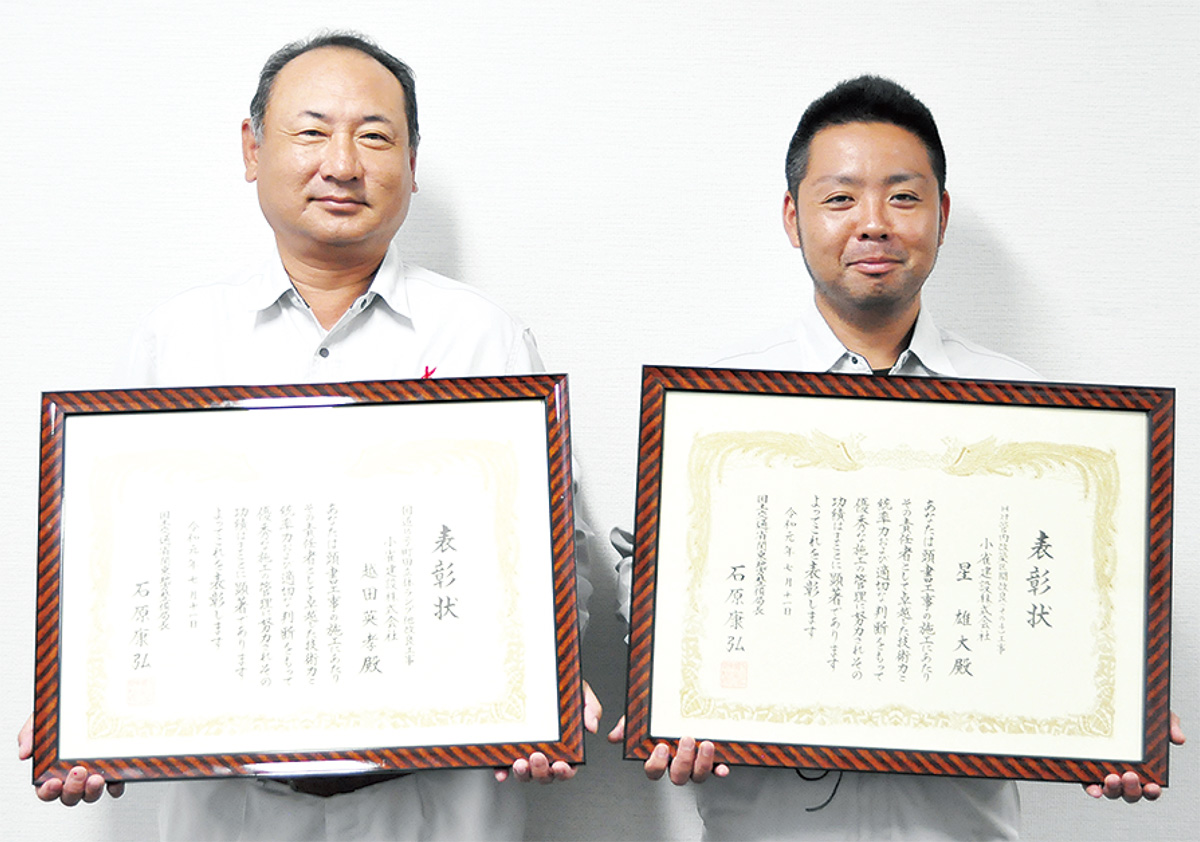 小雀建設株式会社(小泉和雄社長)に勤務する越田(こしだ)英孝さんと星雄大さんが先ごろ、国土交通省関東地方整備局から優秀工事技術者表彰を受賞した。