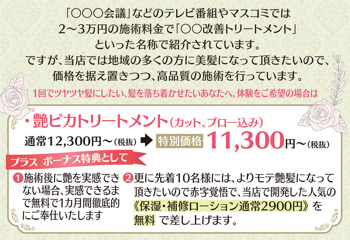 ですが正しいヘアケア、髪を傷めない美容施術をすることで、髪の悩みが気にならなくなります。私たちは長年の研究から、本当のサラ艶・モテ艶髪にするノウハウを持っていますので、まずはご来店ください。でも「本当に一回で艶髪になるの?」と信じられないという場合は左記をご覧ください。