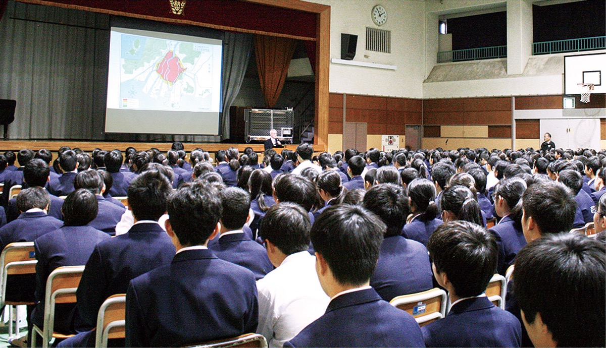 「全校道徳」として行われたこの授業。生徒に多角的に原爆・核を捉えさせるため、8人のアメリカ人が広島、長崎に投下した原爆を肯定するか、否定するか討論を行う――ストーリーの小説「ある晴れた夏の朝」のあらすじを事前に読ませ、自由に自分の考えをワークシートに記入させた。その上で広島平和文化センターが委嘱している被爆体験伝承者の末岡さんの講話を行った。念入りに準備を整えた理由を狩野久幸校長は「核問題は難しいが、中学生の段階で考えさせたかった」と話す。