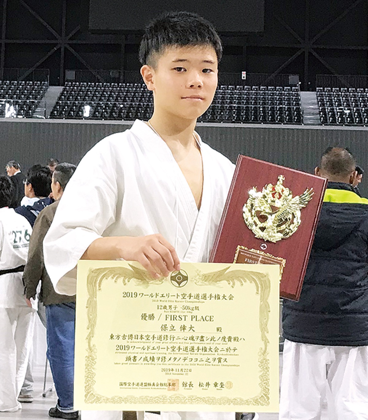 大正中1年生の保立倖大(ほたてこうた)君が、11月22日に武蔵野の森総合スポーツプラザ(東京都)で初開催された極真空手の国際大会「2019ワールドエリート空手道選手権大会」の中学1年生50kg以下の部で、優勝を飾った。この”世界の覇者”をかてに、次のステージに見据える「重量級」での活躍を誓う。