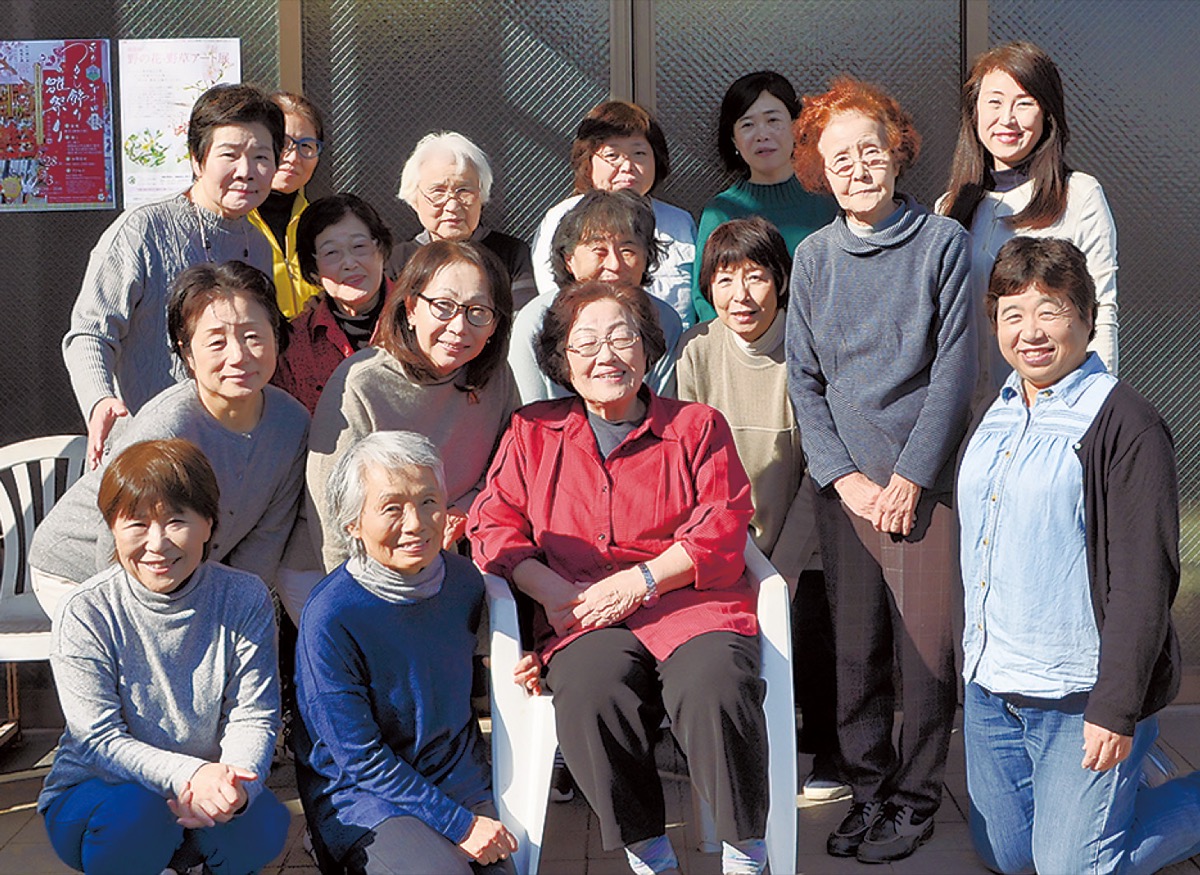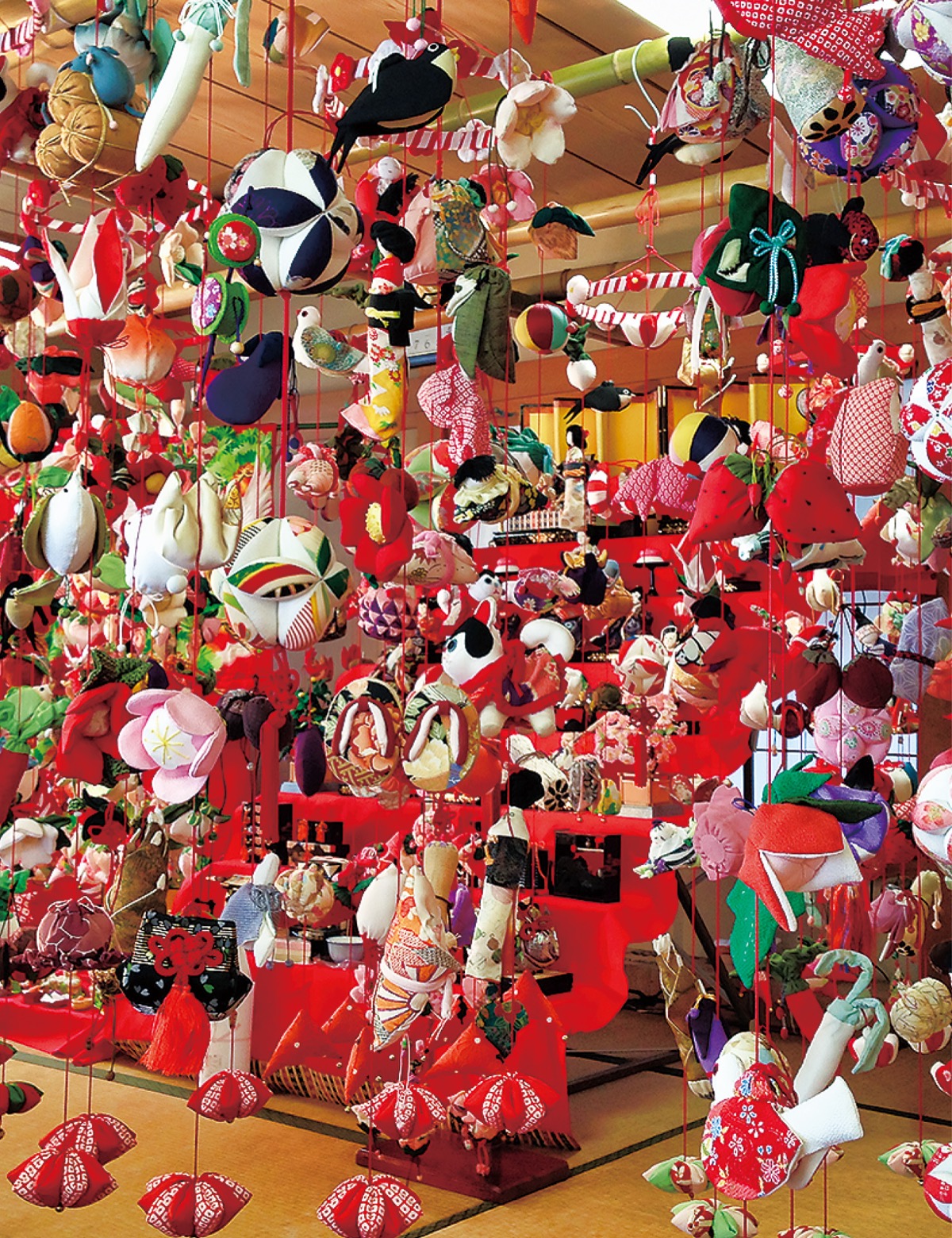 古布などを使い大小さまざまなひな飾りや置物飾りなどを作成する「みやびの会」。福島さんが平戸平和台町内会館で15年ほど前に始めたつるし飾り教室が前身となり、2010年に同会が設立された。現在は第1・第4木曜日の月2回、集会施設豊荘「果樹の里」で教室を開催、22人が在籍している=写真下。