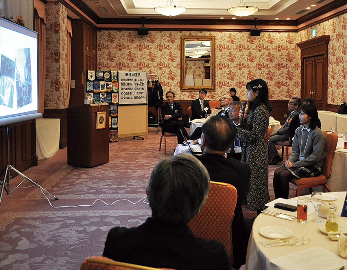 当日は生徒による司会進行で幕を開け、古屋会長が「若い意見を聞けるというのはなかなかない。毎年この報告を楽しみしている」とあいさつ。その後、IACの上田桃子さん(3年)と安達澪さん(3年)による報告会が行われ、現地のRCなどとの交流の様子が語られた。