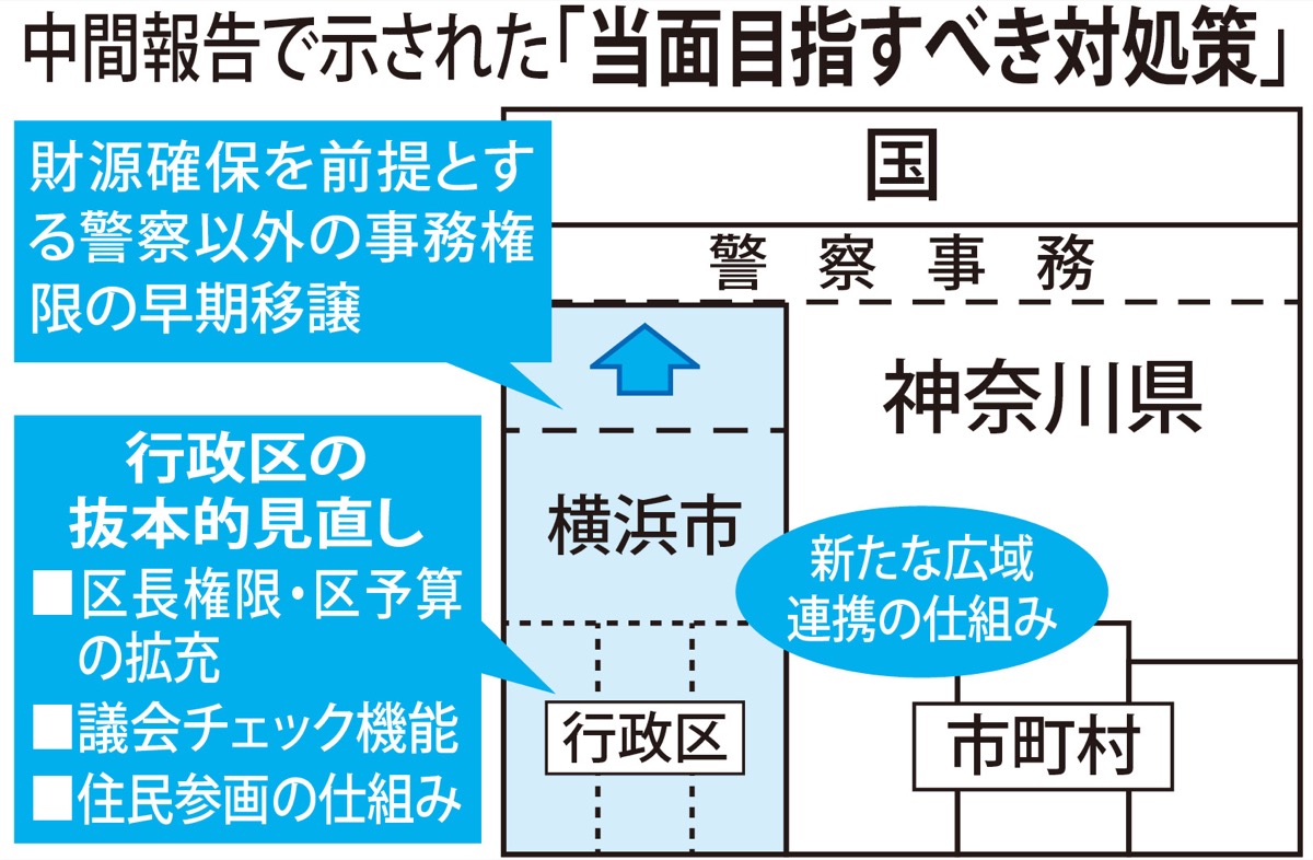 横浜市が二重行政の解消などを目的に県から独立する「特別自治市」を目指す中、林文子市長の諮問機関が3月下旬に区の機能強化など、行政区の抜本的見直しを盛り込んだ答申の中間報告を公表した。特別自治市実現へ足踏み状態の中、市は「当面目指すべき対処策」を示し、事態好転を図ろうとする。