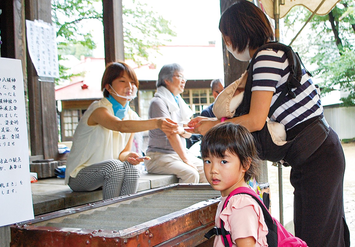 多数の来場者でにぎわう「お札まき」は元禄時代から続き、古くから疫病退散の意味があるという。母と弟と参拝に来た吉野ことはちゃん(4)は昨年の札を返し、新しい札を受け取って力強く握りしめた。