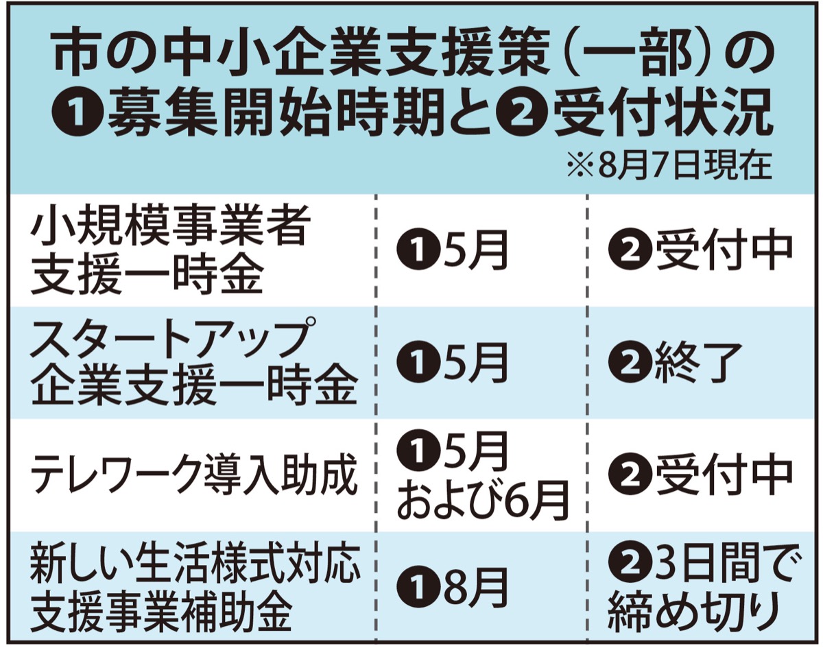 今回の補助金の予算規模は12億円。補助上限額は法人で最大30万円、個人事業主で最大15万円となる。対象はコロナ禍の「新しい生活様式」に対応する備品購入費や内装工事等の経費。3日間で5712件のエントリーがあり予定件数に達した。一方で5、6月に募集が始まった、同様に中小企業を支援するための「小規模事業者支援一時金」「テレワーク導入助成」は、8月7日現在、上限に達していない。