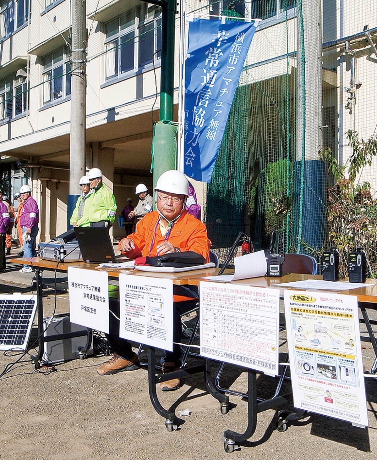 「横浜市アマチュア無線非常通信協力会」は、市の要請により48年前に各区のアマチュア無線家が集まり発足。震度5強以上で電話が使えない際、役所からの要請を受け通信協力をボランティアで行う団体だ。戸塚区支部では無線従事者免許を保有する20代から80代の52人が所属する。