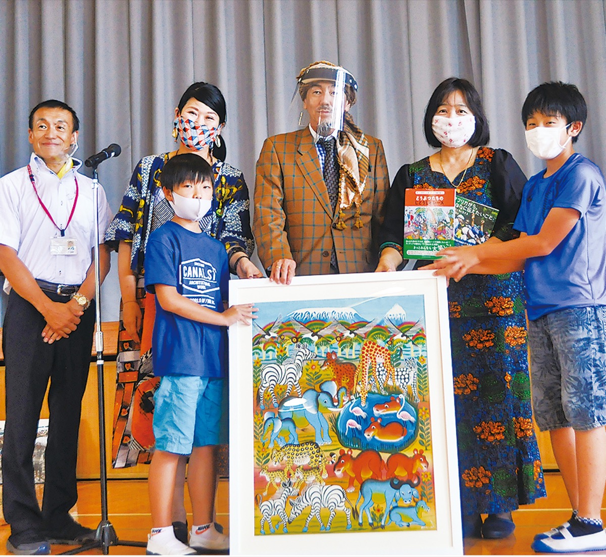 交流会では自らの経験や考えを児童に伝えたほか、絵画と絵本の寄贈も。その後、児童たちがティンガティンガに挑戦。現地で学んだアーティストから「失敗を恐れずに描いて」と伝えられ、児童はタンザニア文化を実地で学んでいた。島岡さんは「身近な友達が困っていたら支えたいという志をもって過ごして」と語り、女子児童は「日本が幸せで、当たり前じゃないという話が心に残った。志を持って過ごしたい」と話した。