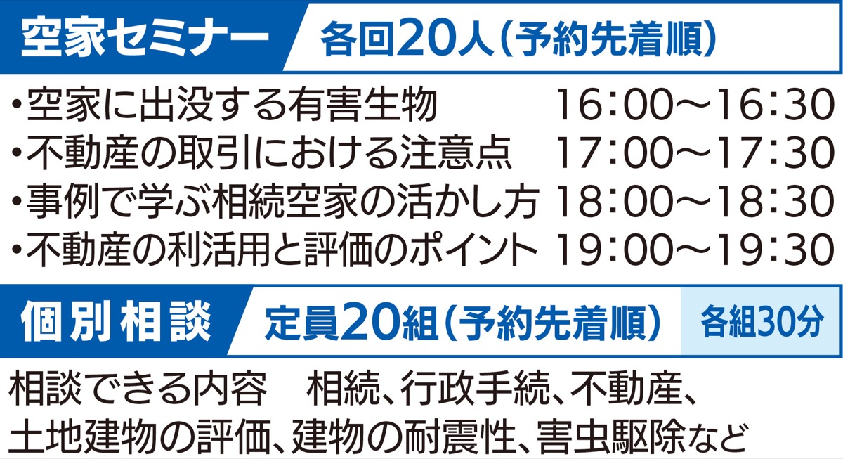 当日は専門家による空家セミナーと、30分間の個別相談会を実施。まずは専門家の話を聞きたい人、具体的な相談をしたいという人はこの機会に足を運んでみては。