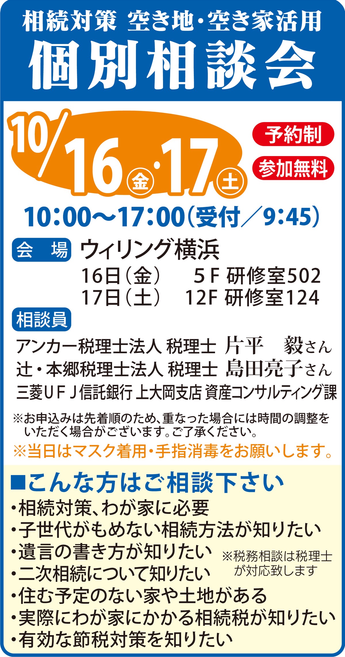 「わが家に相続税はかかるの?」「節税対策は必要?」などの疑問を気軽に相談できるほか、不動産の分割や節税対策、空地の賢い活用方法など一人ひとりの条件で、丁寧なアドバイスが受けられる。希望者は左記へ。