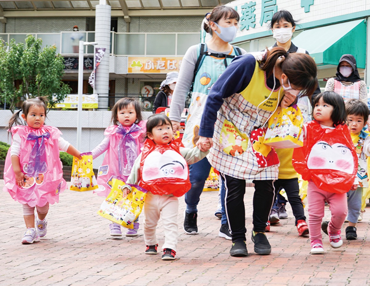 3園の園児約50人がカラフルな手作り衣装を身にまとい、南の街周辺を巡りました。立ち寄り先の店舗などでは保育士の合図で「トリック・オア・トリート」と声を揃え、園児は店員らから嬉しそうにお菓子を受け取っていました。同第3保育園の小川淳子園長は「普段から散歩で歩くコースですが、お店の方と接触することは少ないので、こういう機会に顔を合わせて園のことを知ってもらえたら」と話していました。
