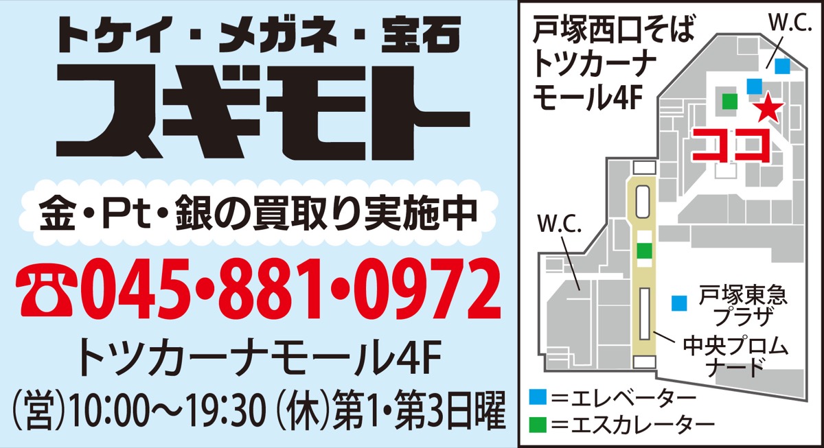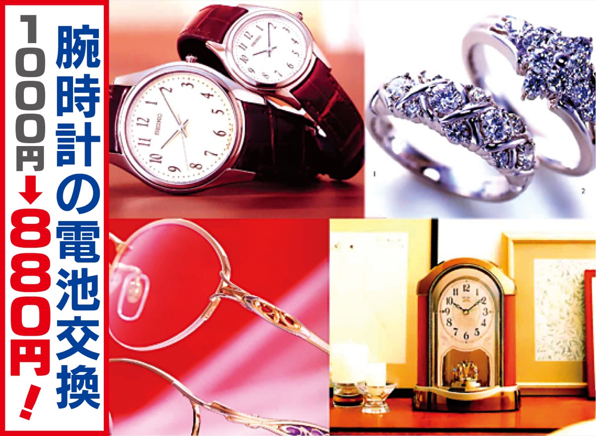 創業73年、トツカーナ4階の「スギモト」が、毎年恒例の歳末感謝セールを12月末まで開催中。宝飾品とメガネが30%オフ、腕時計・掛置時計、宝飾品のリフォームが20%オフになるほか、腕時計の電池交換1000円が880円に(一部異なる場合あり)。特別価格のパールネックが34800円、5000円以上お買上げで特製カレンダープレゼント。この機会をお見逃しなく。