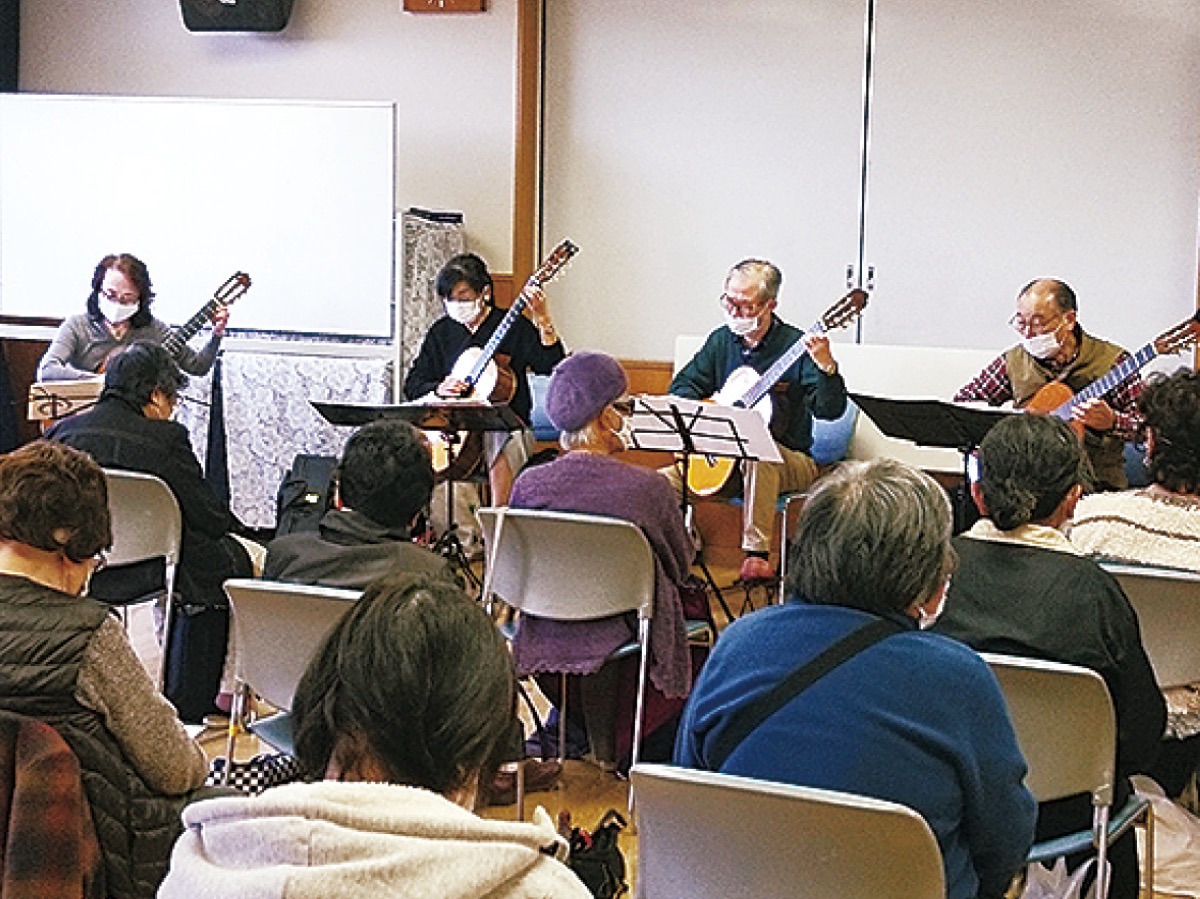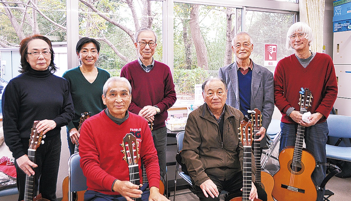 汲沢地域ケアプラザを拠点に活動するクラシックギターアンサンブルの「ハーモニーグリーン」という団体がある=写真。設立8年目で、年間14回ほどケアプラザや地区センターなどでクラシックギターの演奏会を開く自主団体だ。