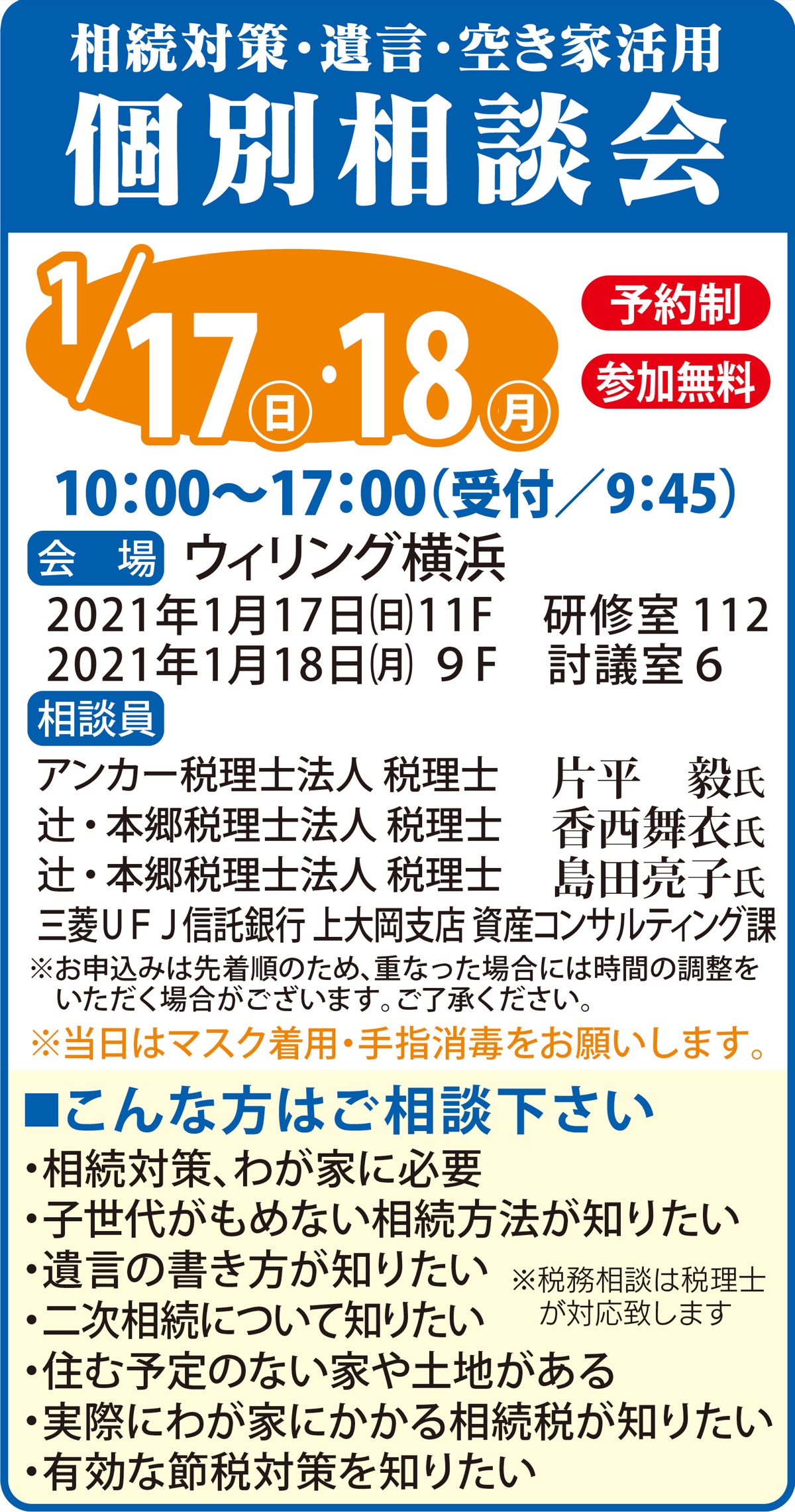 「わが家に相続税はかかるの?」「節税対策は必要?」などの疑問や遺言書の書き方や保管方法をはじめ、不動産の分割や節税対策、空き家の賢い活用方法など気軽に相談できるチャンス。予約制のため希望者は左記へ。