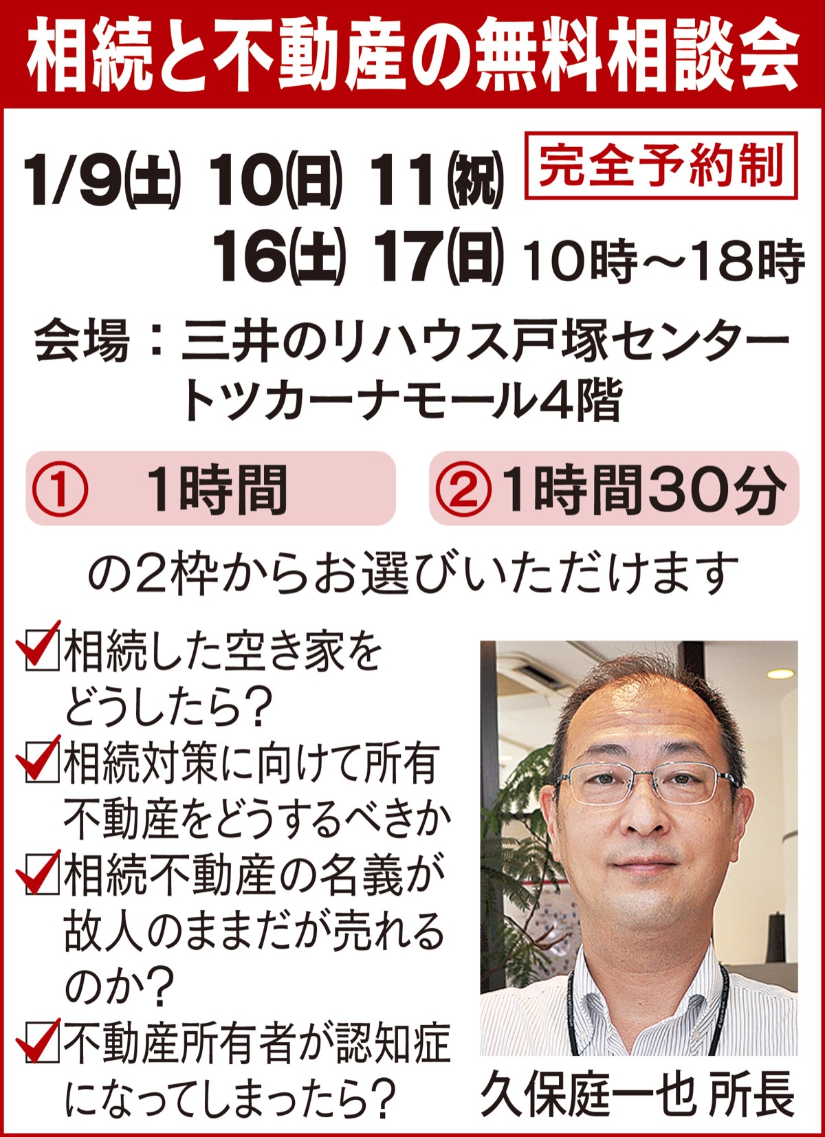 「相続した空き家をどうすれば?」など家の問題に悩む人に向け、トツカーナモール4階の三井のリハウス戸塚センターで1月9日(土)10日(日)11日(祝)と16日(土)17日(日)に好評の「相続と不動産の無料相談会」が開催される。秘密厳守の完全予約制。午前10時〜午後6時の時間内で1時間又は1時間30分の2枠から選択を。
