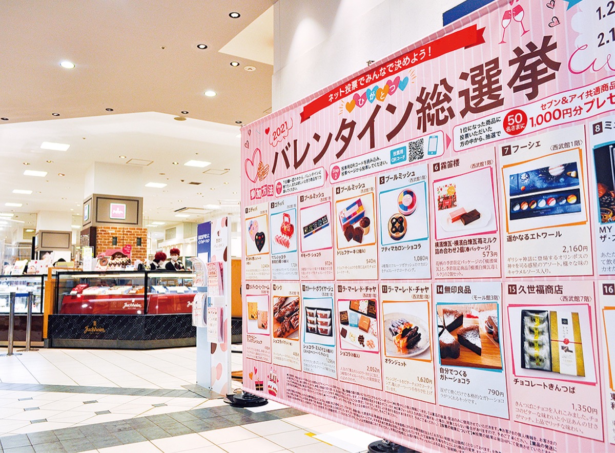 コロナ禍の今年、西武東戸塚S.C.ではネット上で店頭に並ぶ商品の人気順位を決める「ひがとつ2021バレンタイン総選挙」を実施中。選挙に立候補したブールミッシュやミュゼ・ド・ラボーテなど16商品から、好きな商品をネット上で投票する企画で、14日まで受け付けている。1位になった商品を選んだ人の中から抽選で賞品も。担当者は「ボールペンを使わない“非接触”の投票企画。季節イベントを楽しんで」と話している。詳細は同店(https://www.seibuhigashitotsuka-sc.jp/)へ。