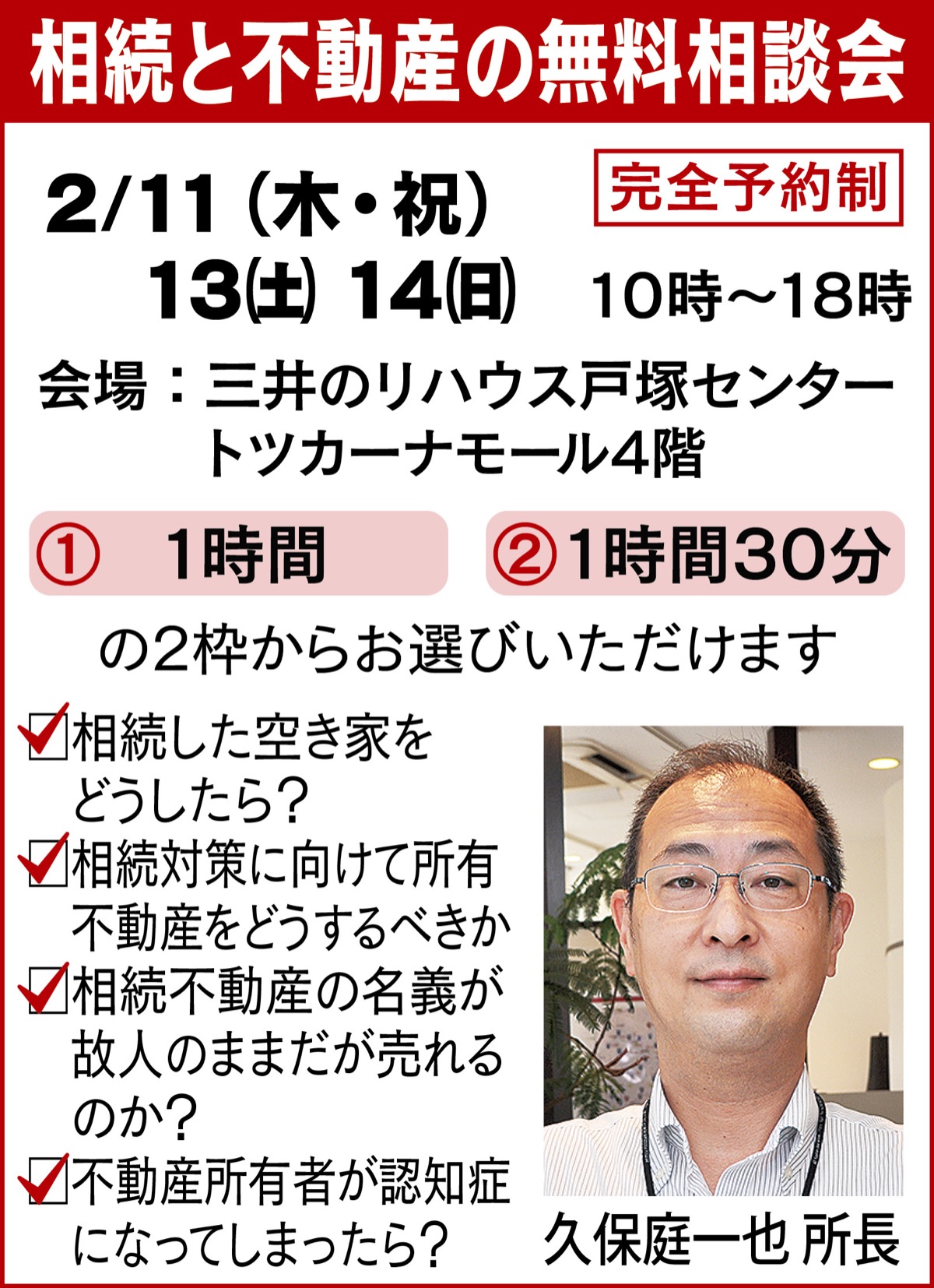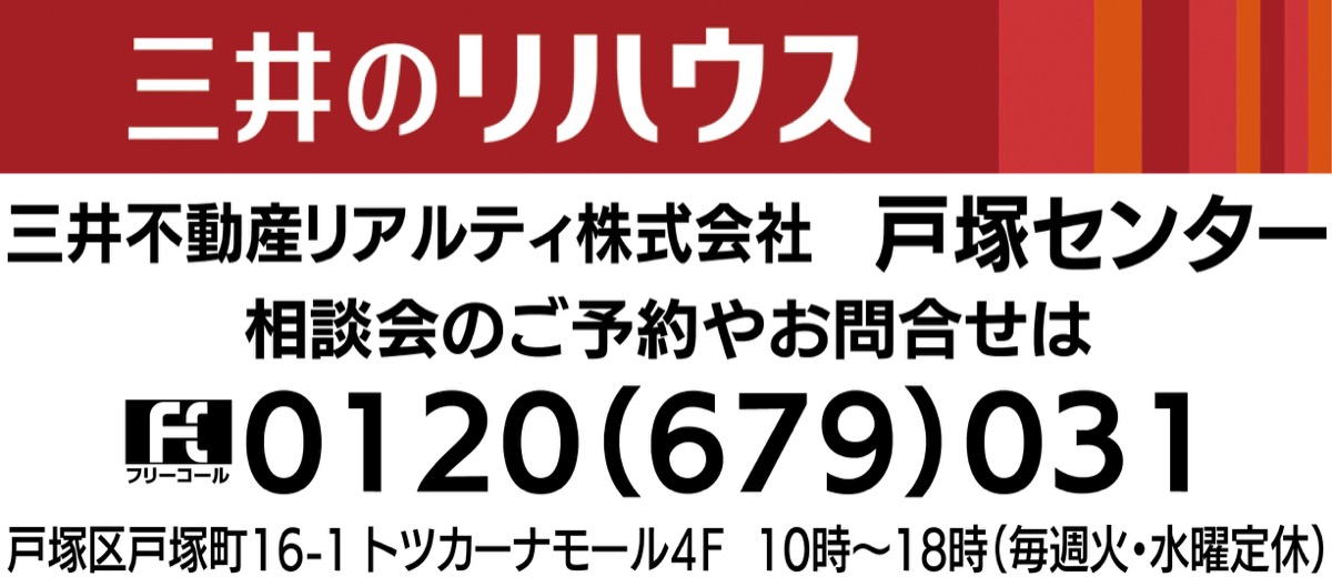 「相続した空き家をどうすれば?」など家の問題に悩む人に向け、トツカーナモール4階の三井のリハウス戸塚センターで本日2月11日(祝)と13日(土)14日(日)の週末に好評の「相続と不動産の無料相談会」が開催される。秘密厳守の完全予約制。午前10時〜午後6時の時間内で1時間又は1時間30分の2枠から選択を。