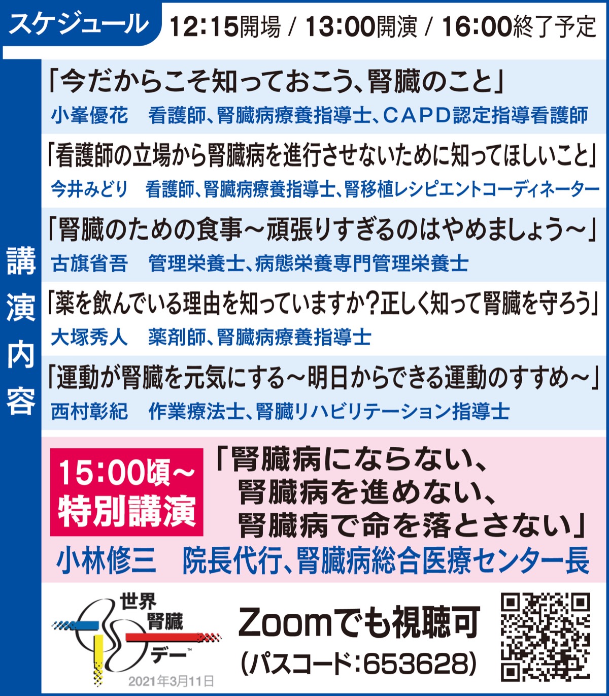 当日は同院院長代行で腎臓病総合医療センター長を務める小林修三医師が「腎臓病にならない、腎臓病を進めない、腎臓病で命を落とさない」と題して特別講演を行うほか看護師、管理栄養士、作業療法士らが、腎臓病の予防と最新の治療に関して発表する=左表。