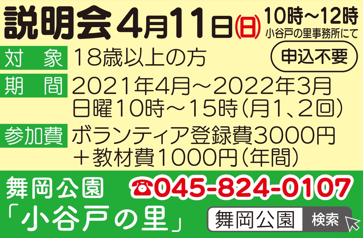 横浜の原風景「谷戸」がそのまま生かされている舞岡公園の小谷戸の里で4月11日(日)、谷戸学校の説明会が開催される。