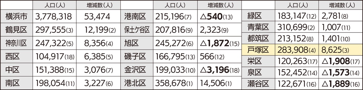 戸塚区の人口市内3位の増加数