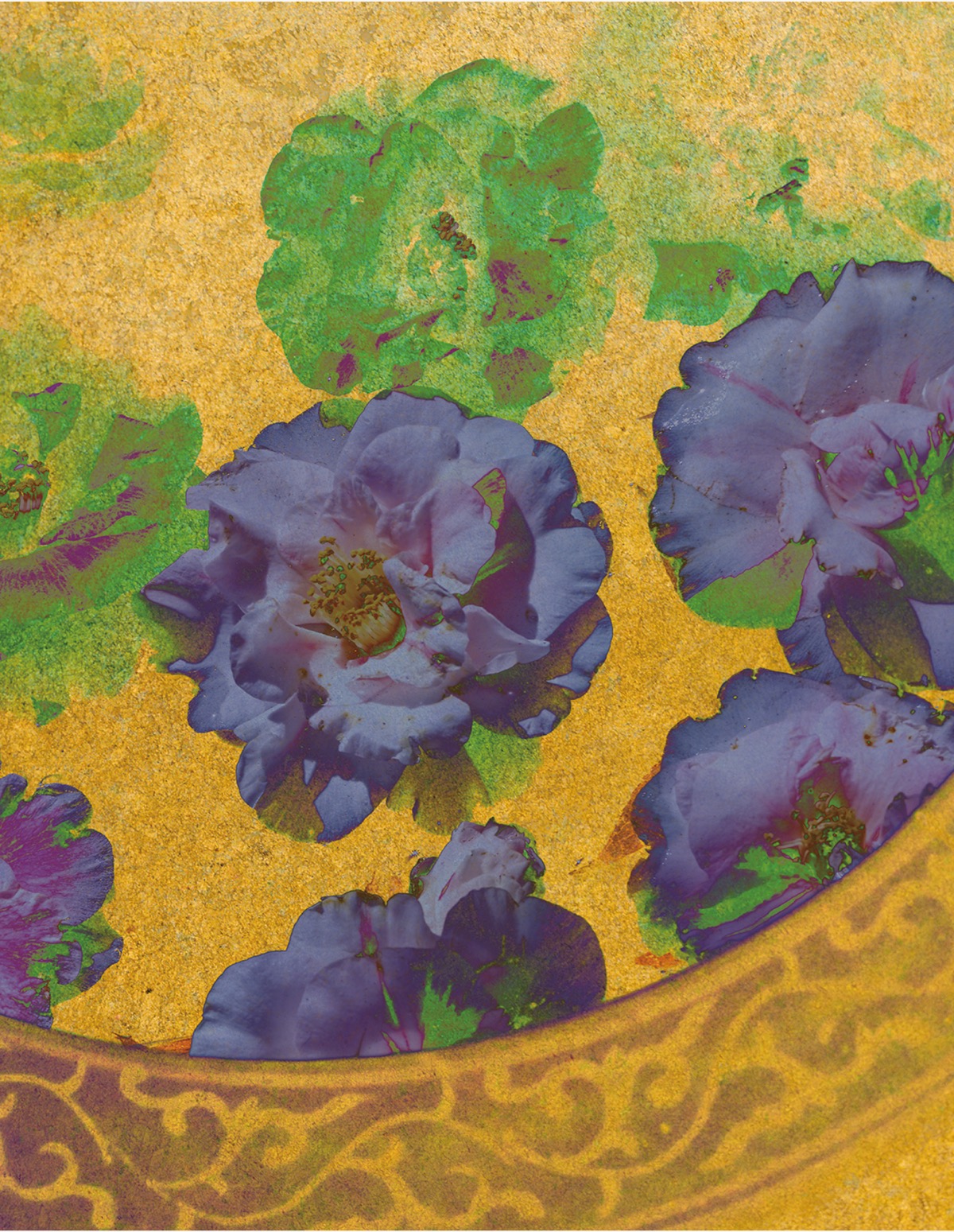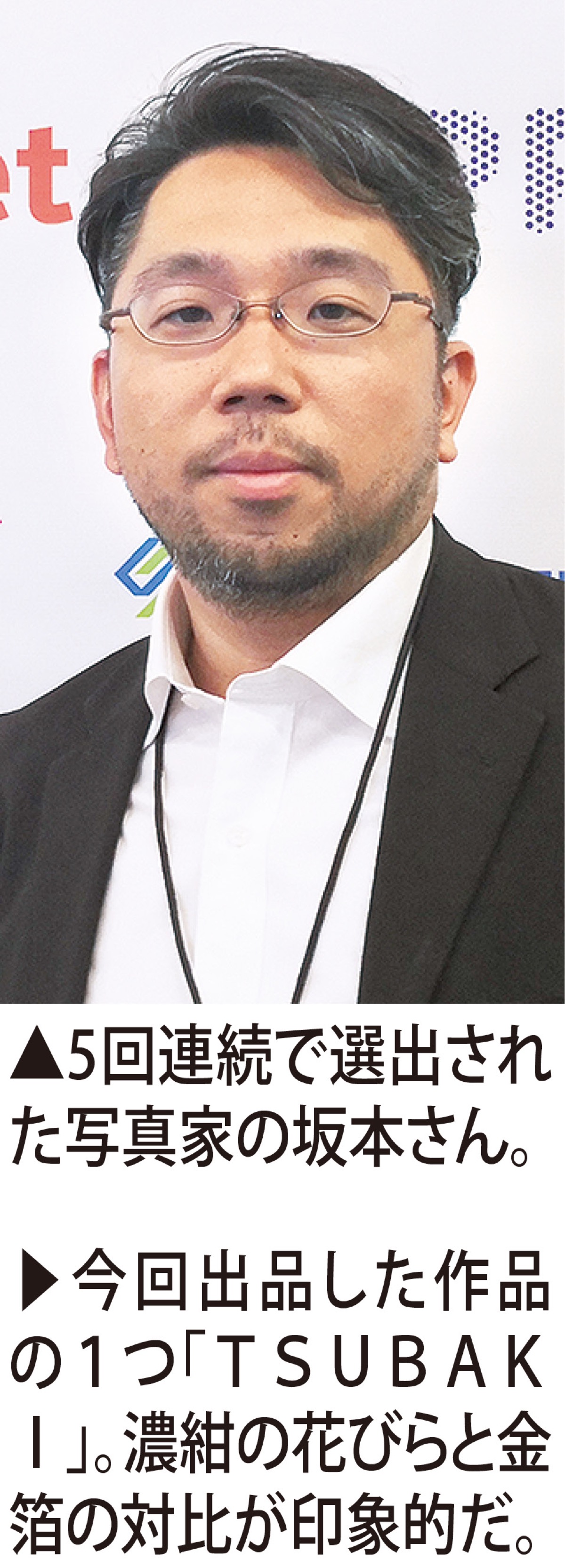 5回連続で選ばれている坂本さん。今回は4作品を出品。そのうちの1つが「TSUBAKI」だ。自宅の庭に奇麗に咲いていた椿の花を数輪を摘み、スタジオで撮影。デジタル処理で金箔をかぶせ、濃紺色の花と対比させ、幻想的な雰囲気を作り出してる。