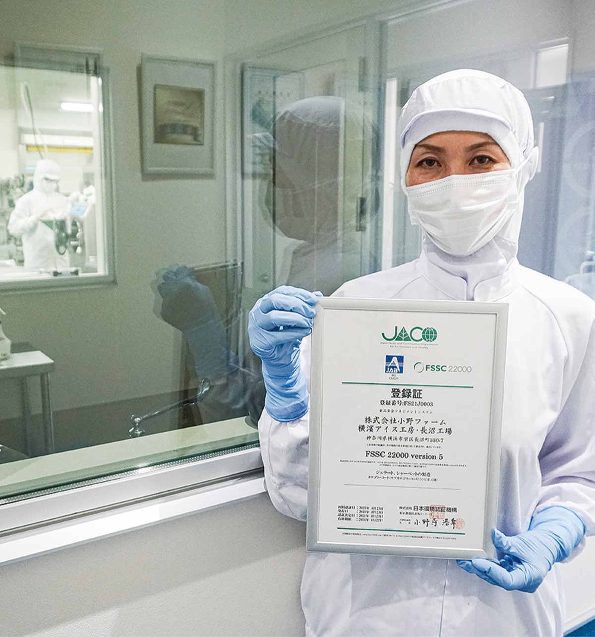 上倉田町に本社を構える(株)小野ファーム(小野利和社長)の「横濱アイス工房」の製造工場(栄区長沼町)が4月23日、食品安全管理の国際規格である「FSSC22000」の認証を受けた。中小規模の事業所での認証は珍しく、国内でも数件だという。