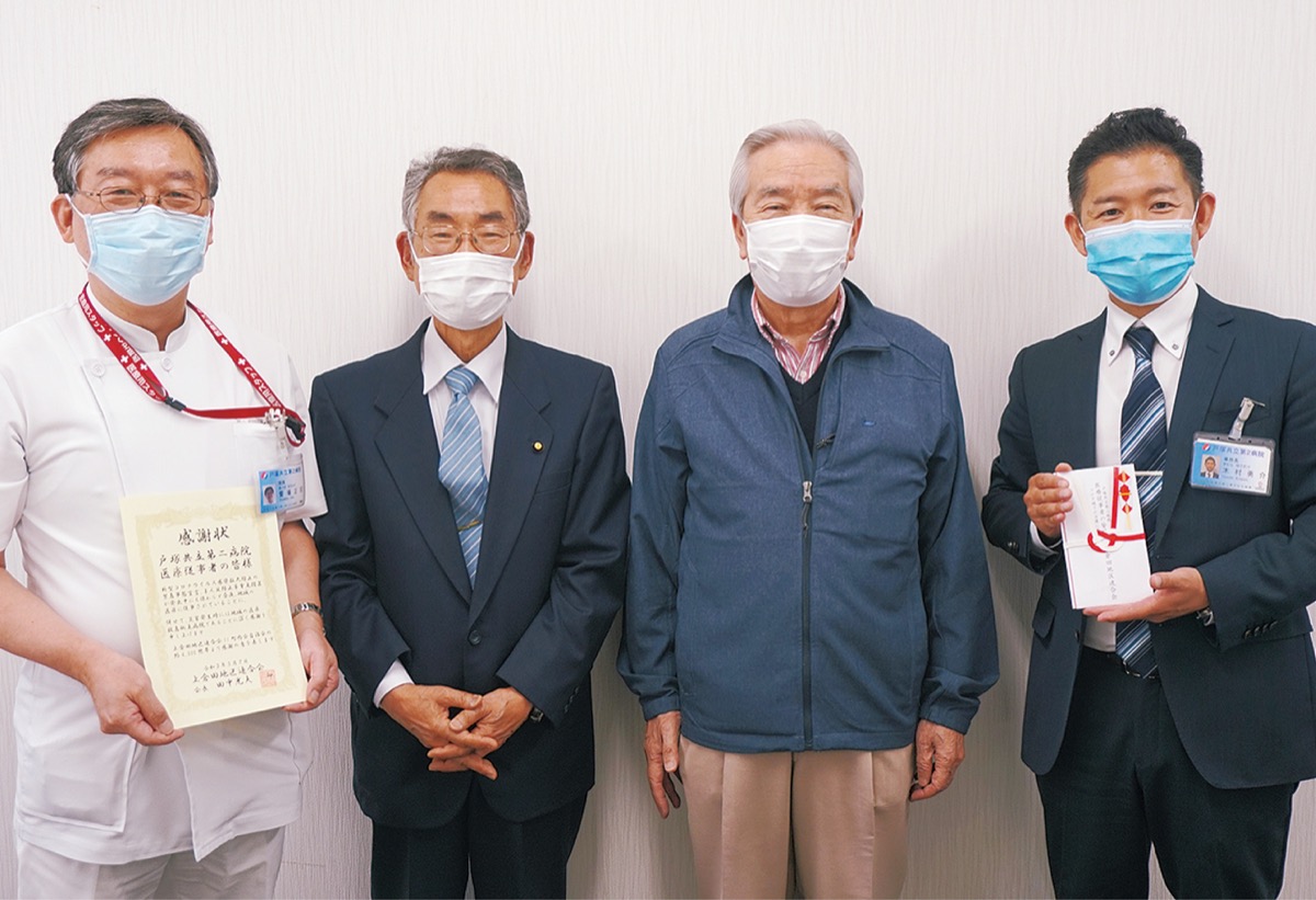 上倉田地区連合会(田中光夫会長)は5月7日、コロナ禍でも日夜、医療活動に従事する地域の医療機関に感謝の気持ちを伝えたいと、戸塚共立第2病院(饗場正宏院長)に感謝状と見舞金10万円を贈呈した。