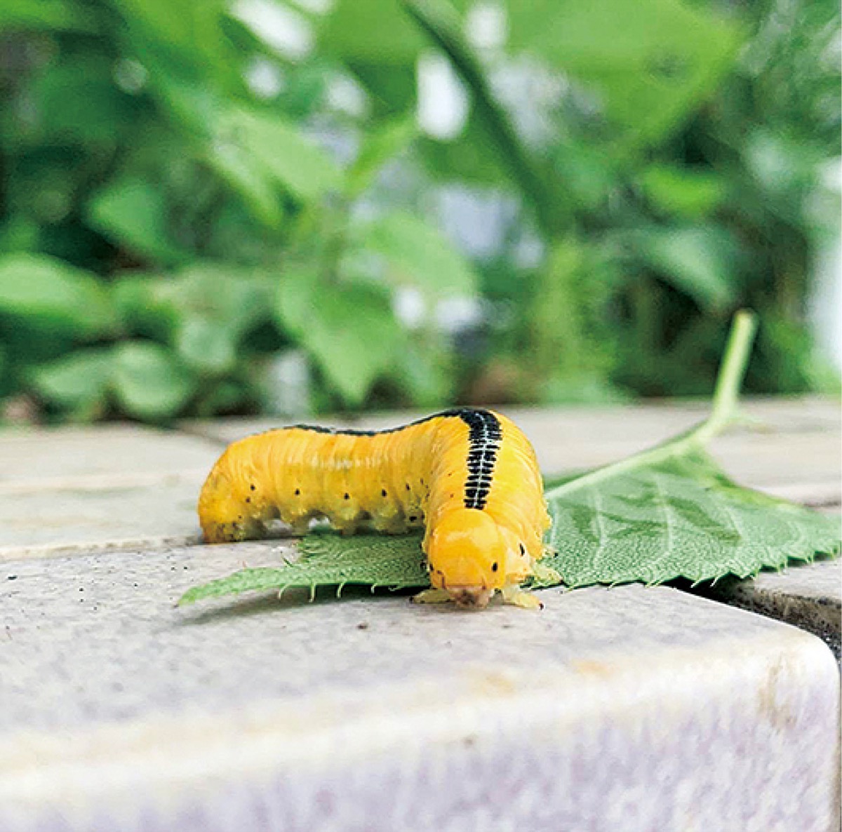 同地域ケアプアラザの正面玄関横にある花壇の整備中、隅にある山桜の木の葉に潜んでいたというナシアシブトハバチ。黄色い体に黒い線が入っているのが特徴で、成虫になるとキイロオオスズメバチそっくりになるそう。第一発見者の石井徹さんは「長年園芸業をやっており日ごろからいろいろな虫を見ていますが、これは初めて見ました。調べてみたら結構珍しい種類だそうです」と話していました。