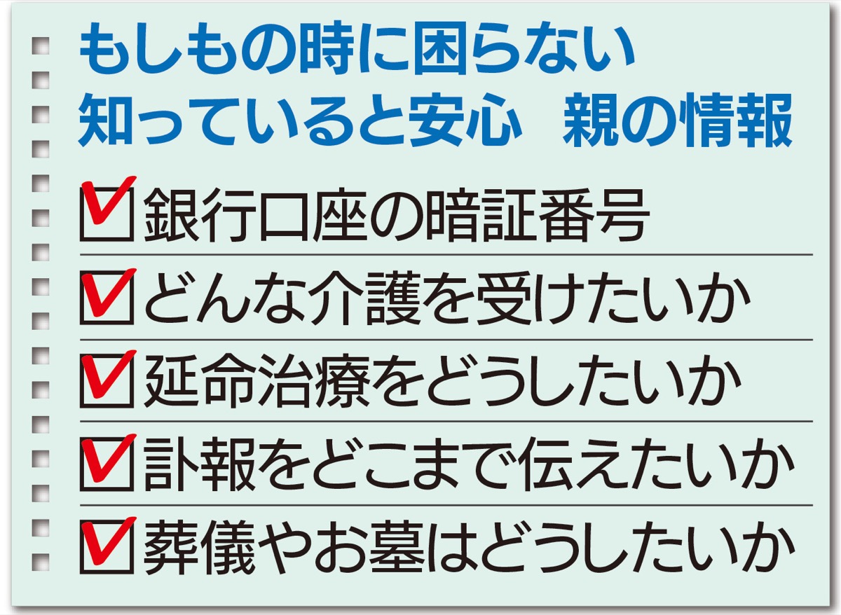 預金等の情報を知らないと子どもが立て替えることがあり、介護や医療の希望がわからないと戸惑ってしまう。