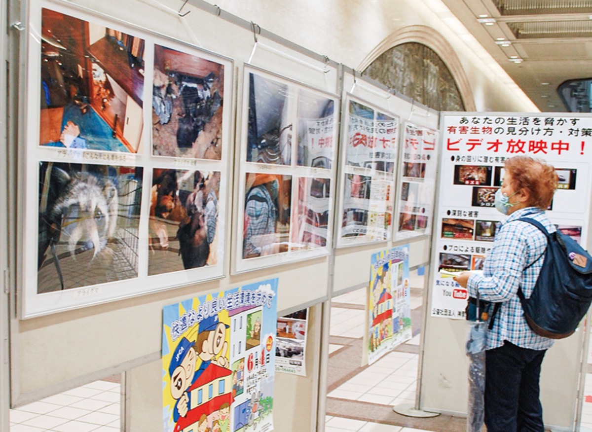 有害生物の駆除などを通じて、公衆衛生の向上と市民の健康や財産を守ることを目的に活動する同会。今回のイベントでは、スズメバチやトコジラミなどの生態に関する写真やポスターをパネル展示し、道行く人に注意喚起をしていた。